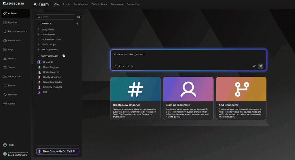 Edge Delta’s collaborative AI Teammates address these challenges. Our agentic observability team autonomously analyzes your alerts and triages issues, correlating data from across your environment and escalating only when human intervention is needed. They’re supplied with real-time data by our intelligent Telemetry Pipelines, which include advanced processors and filters to eliminate noise and preserve only high-value insights needed for investigations.