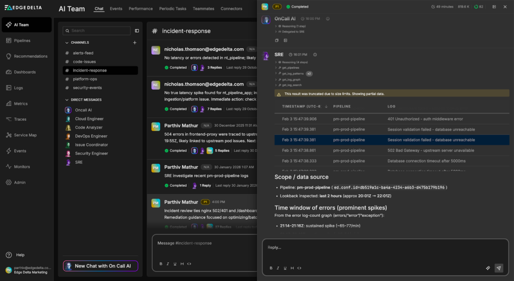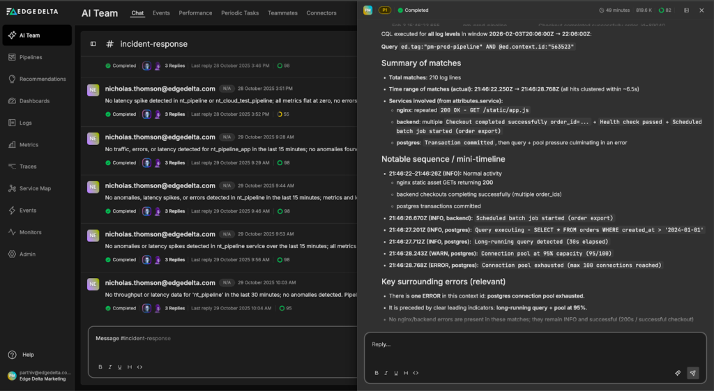Edge Delta’s AI Teammates transform incident response by autonomously correlating signals, diagnosing root causes, and recommending fixes in real time. In our demo, the SRE Teammate immediately identified the problematic SQL query buried in an INFO-level log and traced the cascading impact across services, eliminating the manual detective work that typically consumes hours of engineering time.