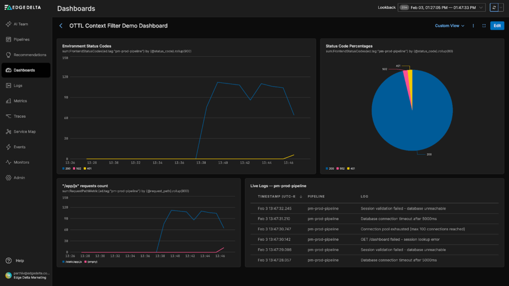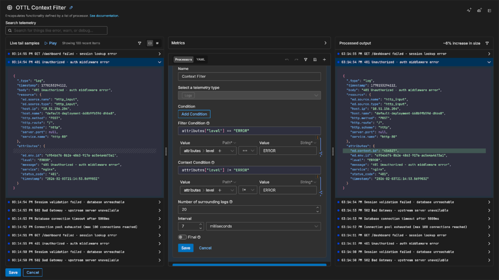 Edge Delta’s OpenTelemetry Transformation Language (OTTL) Context Processor is one of the many pipeline filters that enable this selective data retention. It suppresses context-level logs during normal operations but automatically includes them the moment an incident is detected, ensuring AI Teammates have clean signals and comprehensive context during troubleshooting.