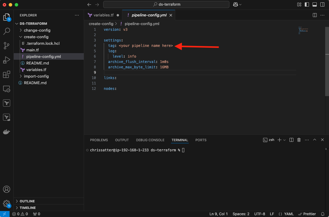 Next, go to the pipeline-config.yml and change the name of the first tag under settings to what you want your pipeline to be named.