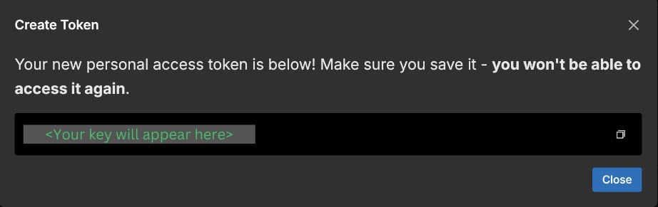 After clicking the “Create” button, your newly generated personal access token key will pop up on the screen. Be sure to save the key, as it will no longer be accessible once you close the window.