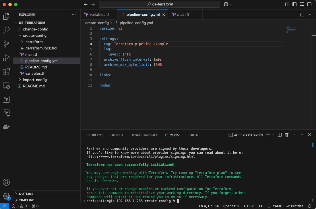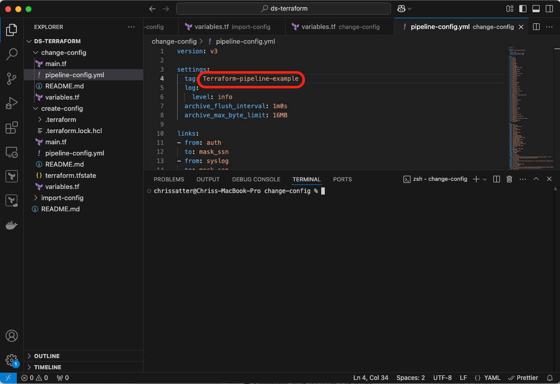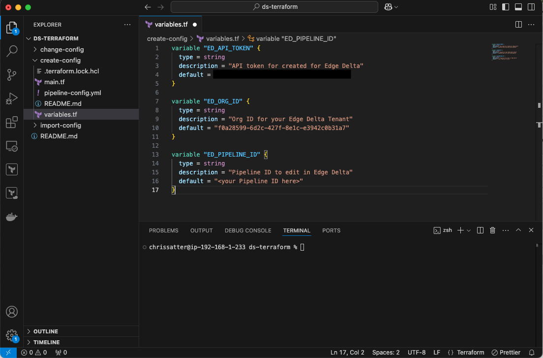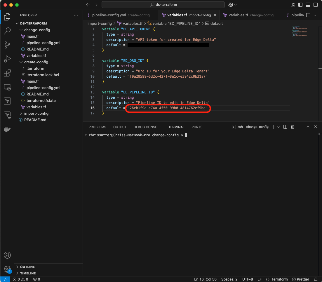 In your terminal, move over to the change-config directory, and while in it, view the variables.tf file. Add the API token and Organization ID as you did in the above step, as well as the Pipeline ID of the newly-created pipeline: