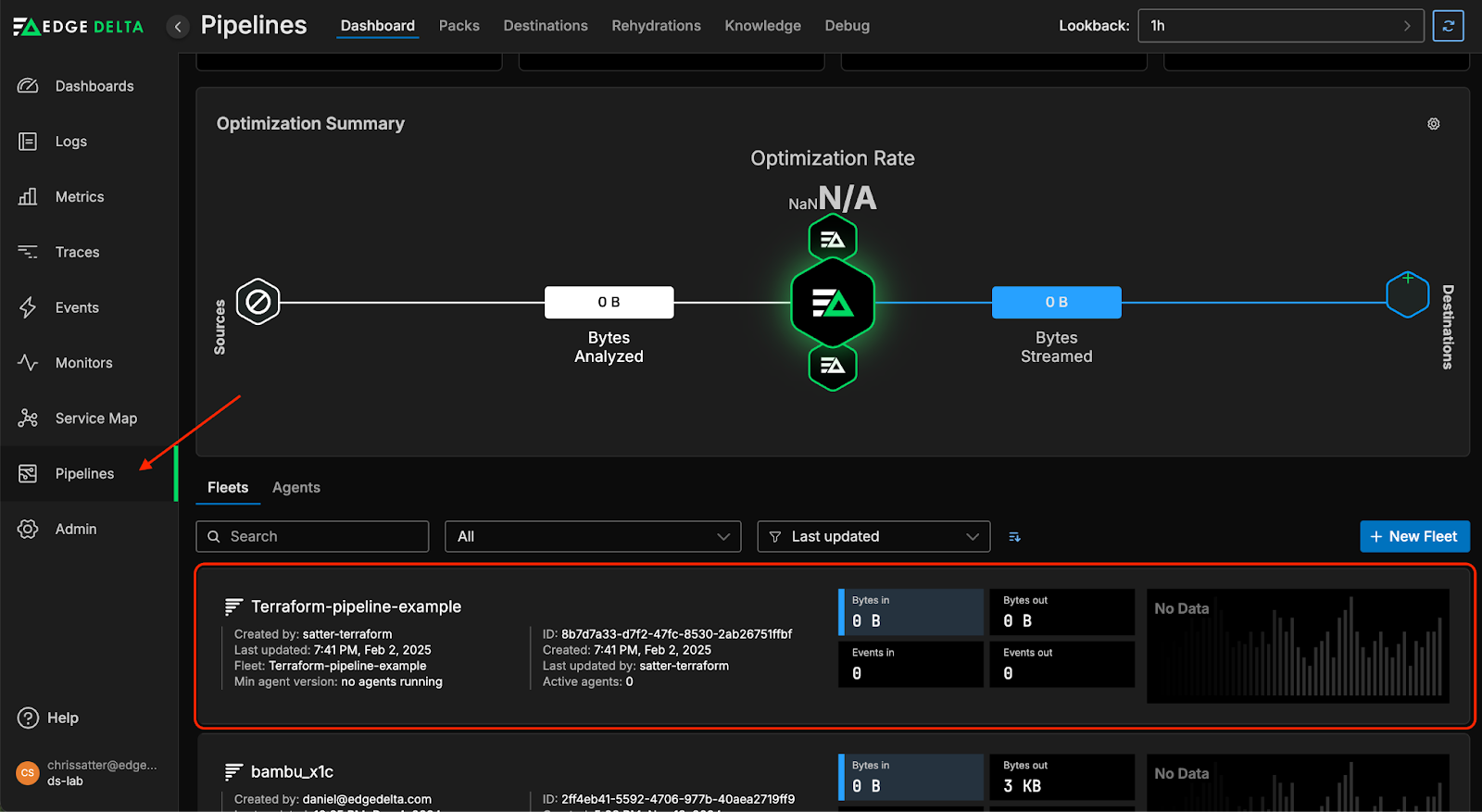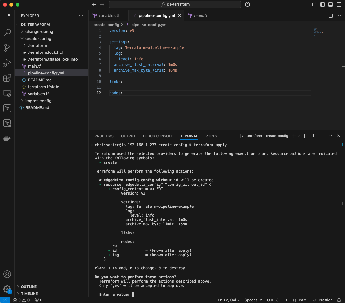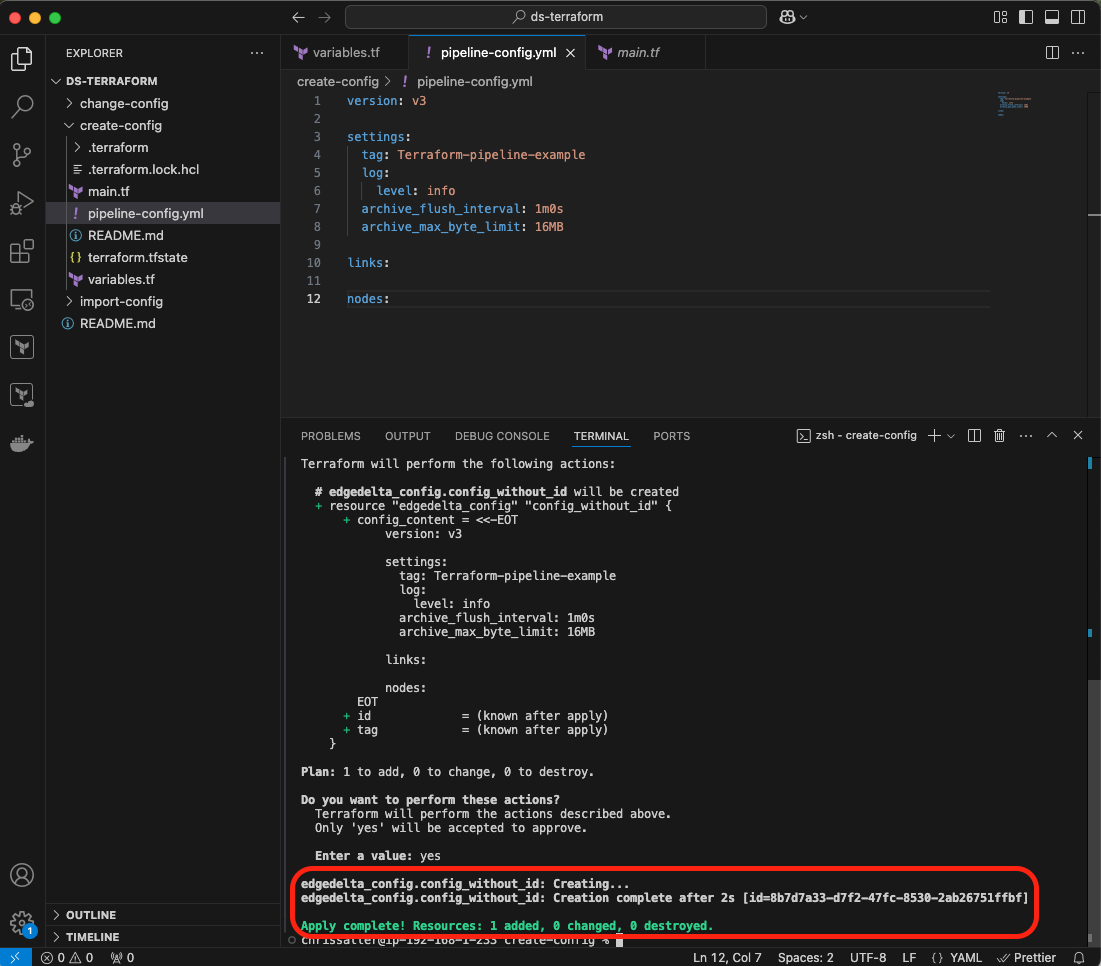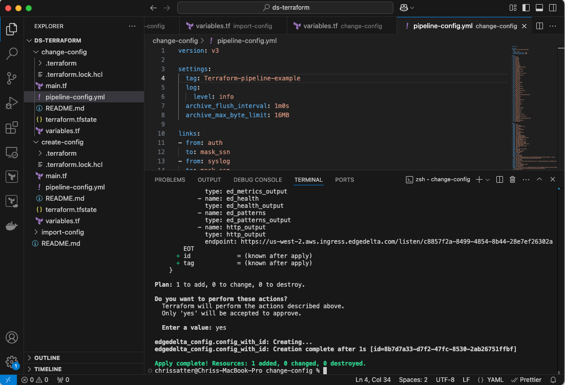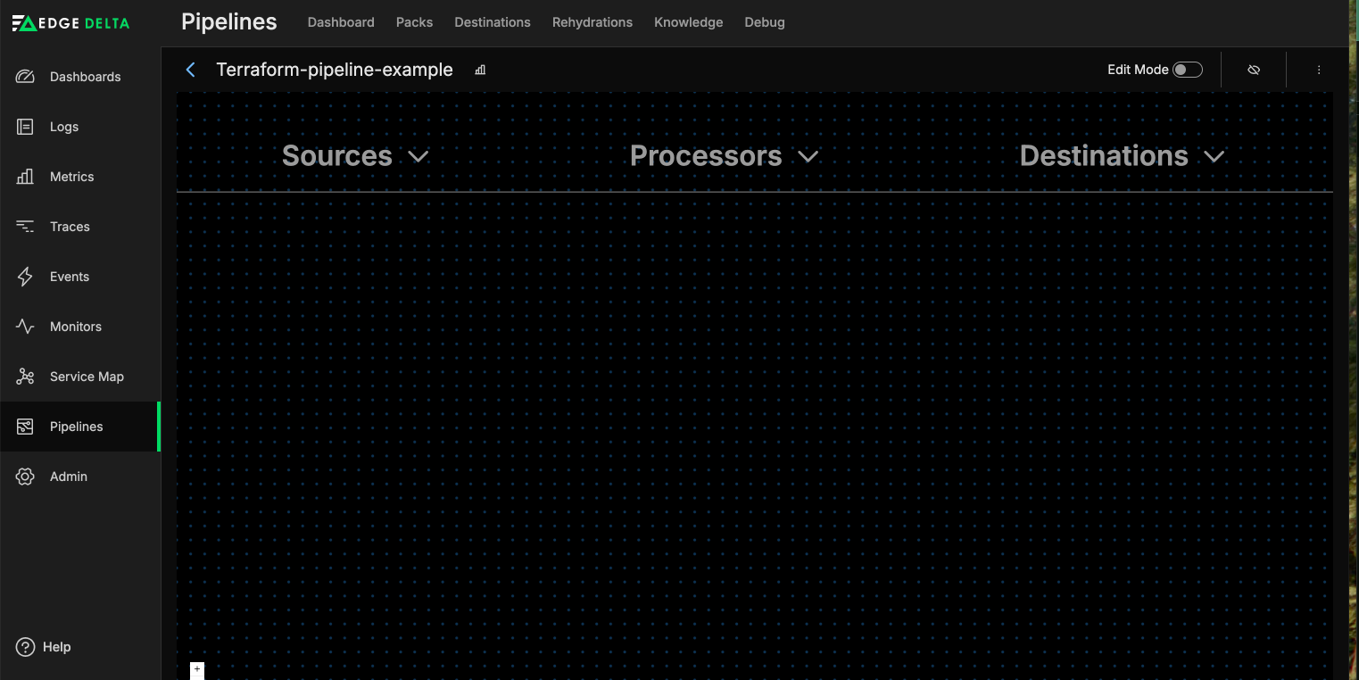 Congratulations! You’ve successfully created a new Edge Delta Pipeline entirely through Terraform. If you want more practice, there is another example in the repo you can try that can import a configuration from another pipeline already in your Edge Delta Fleet listing.