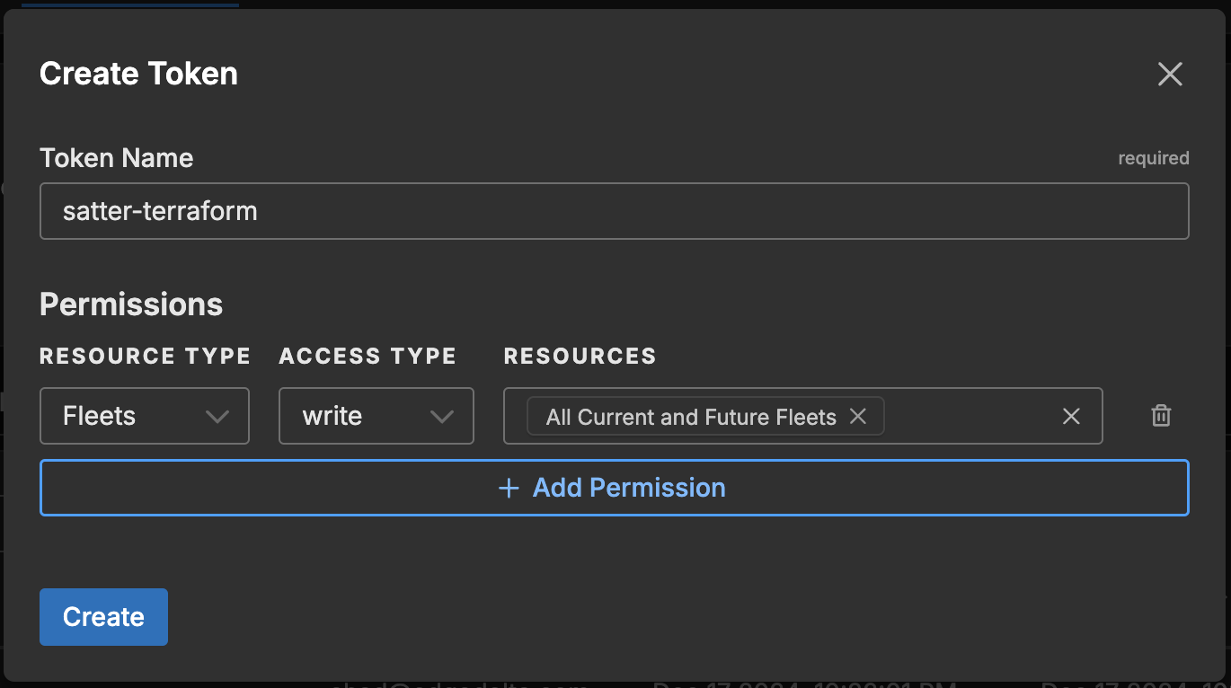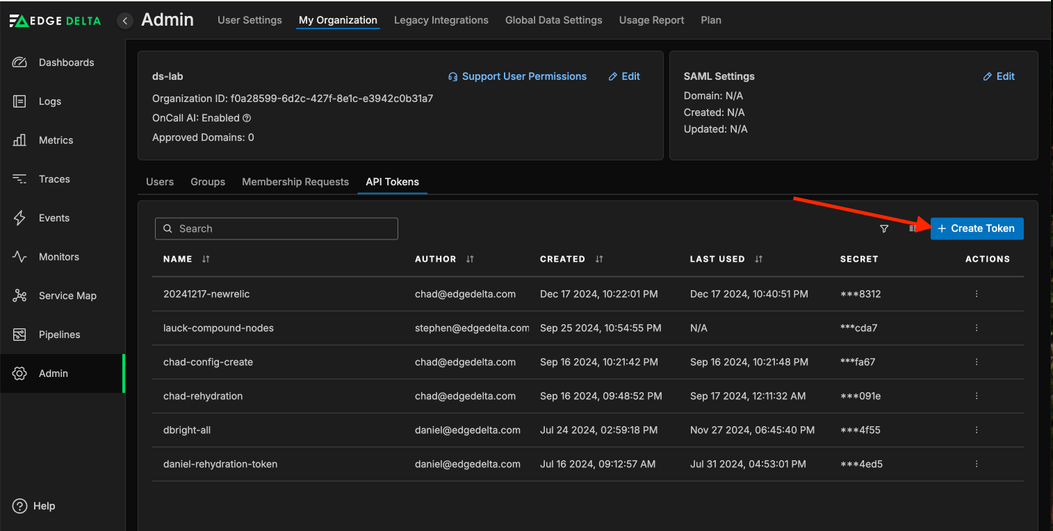 In short, Terraform >= 0.13.0 and the Terraform-provider-edgedelta plugin >= 0.0.1 is recommended. You will also need an API token from your Edge Delta account. To create one, log in at app.edgedelta.com, navigate to Admin -> My Organization -> API Tokens, and click on the “+ Create Token” button.