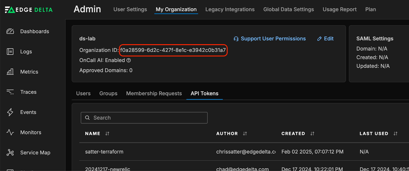 Once the window is closed, you will be brought back to the Admin Page, from where you can grab your Organization ID. This, as well as your API token, will be needed in the {variables.tf} file later on.