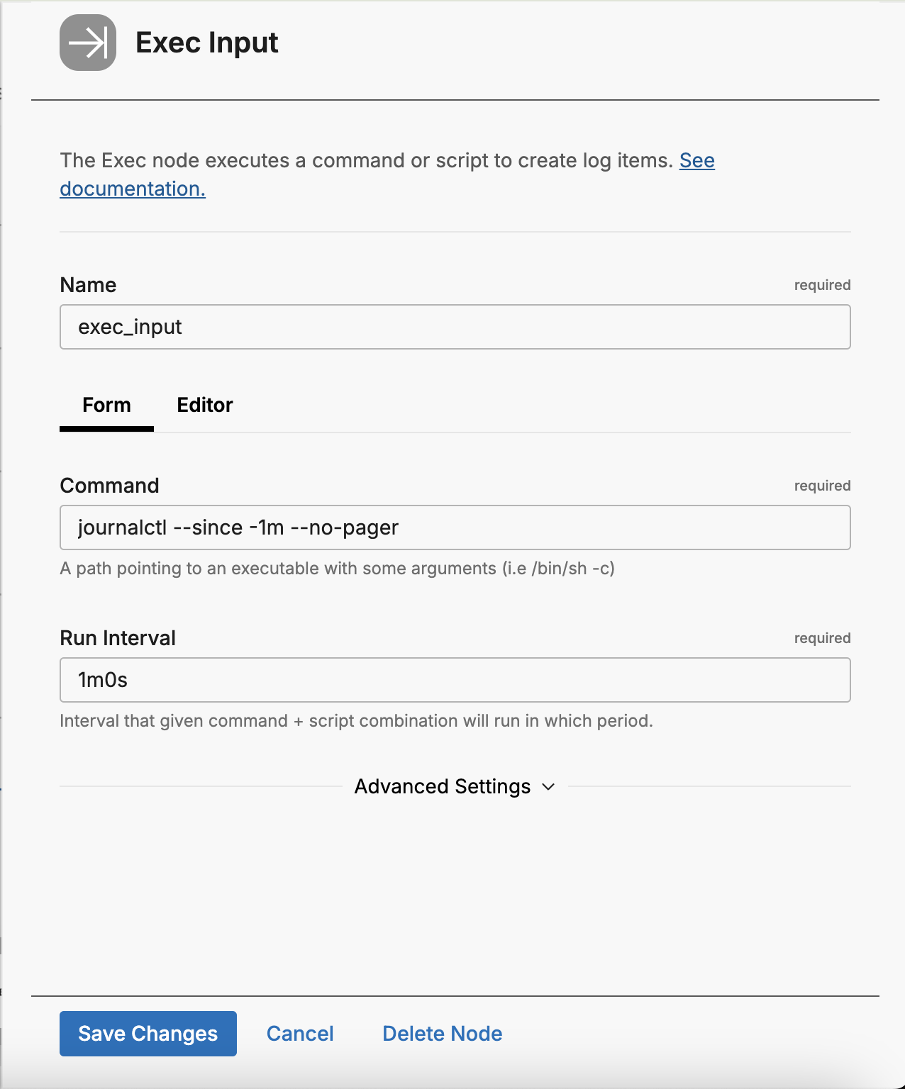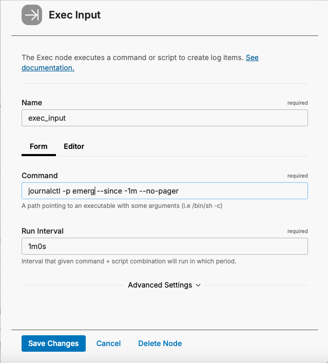- Create and configure an exec input node to get logs from journalctl
