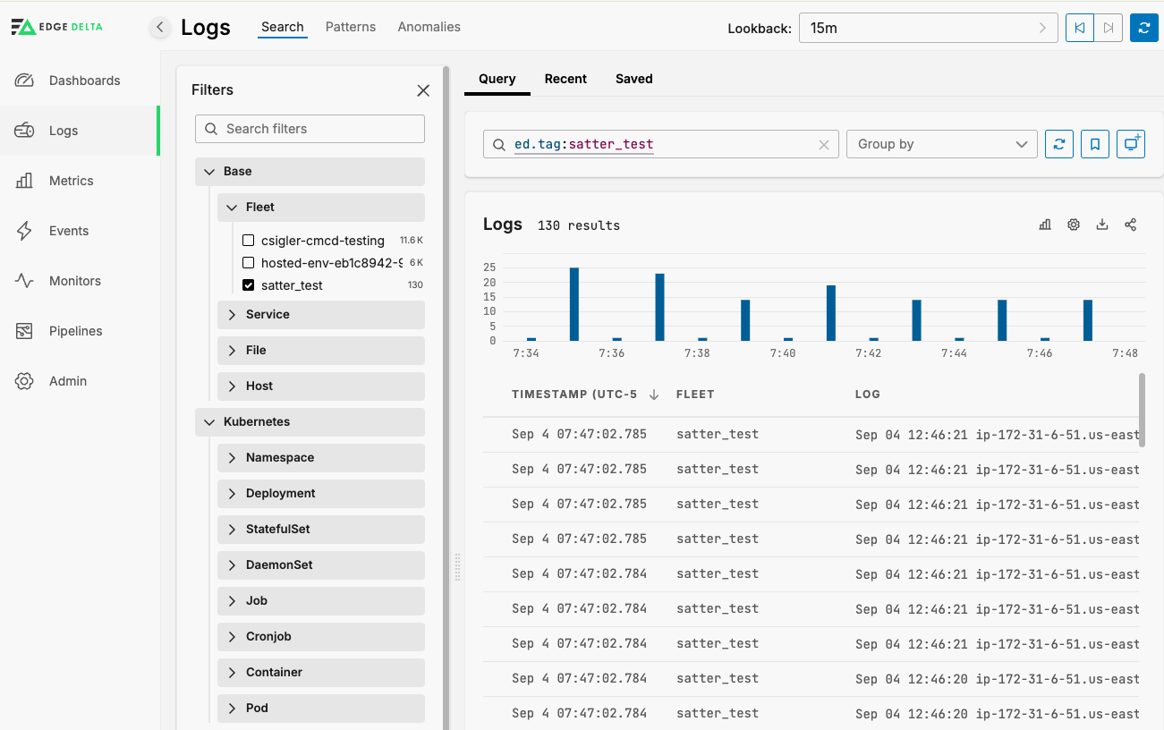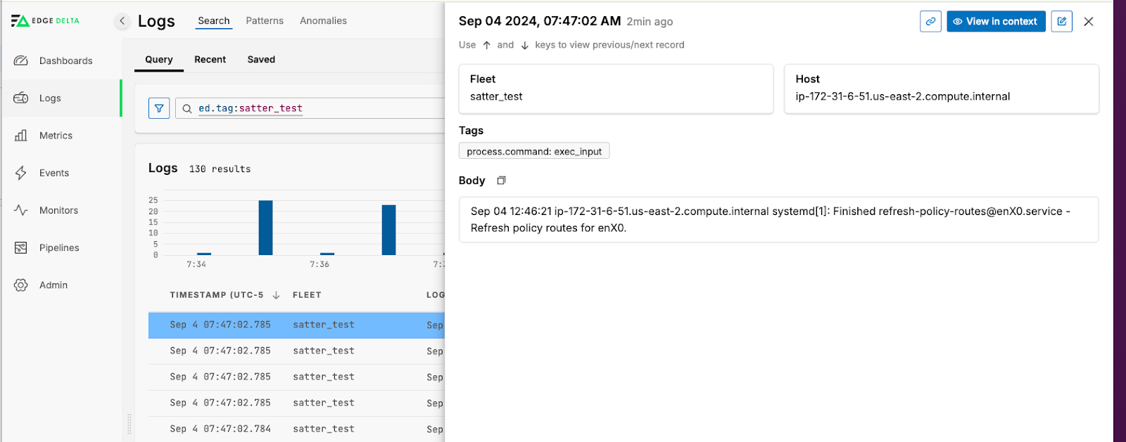 Once you have saved your Exec Input node, attach it to the ed_logs output node and apply the configuration. The changes will now apply to your agent(s) and you will be able to see logs in Edge Delta Log Search: