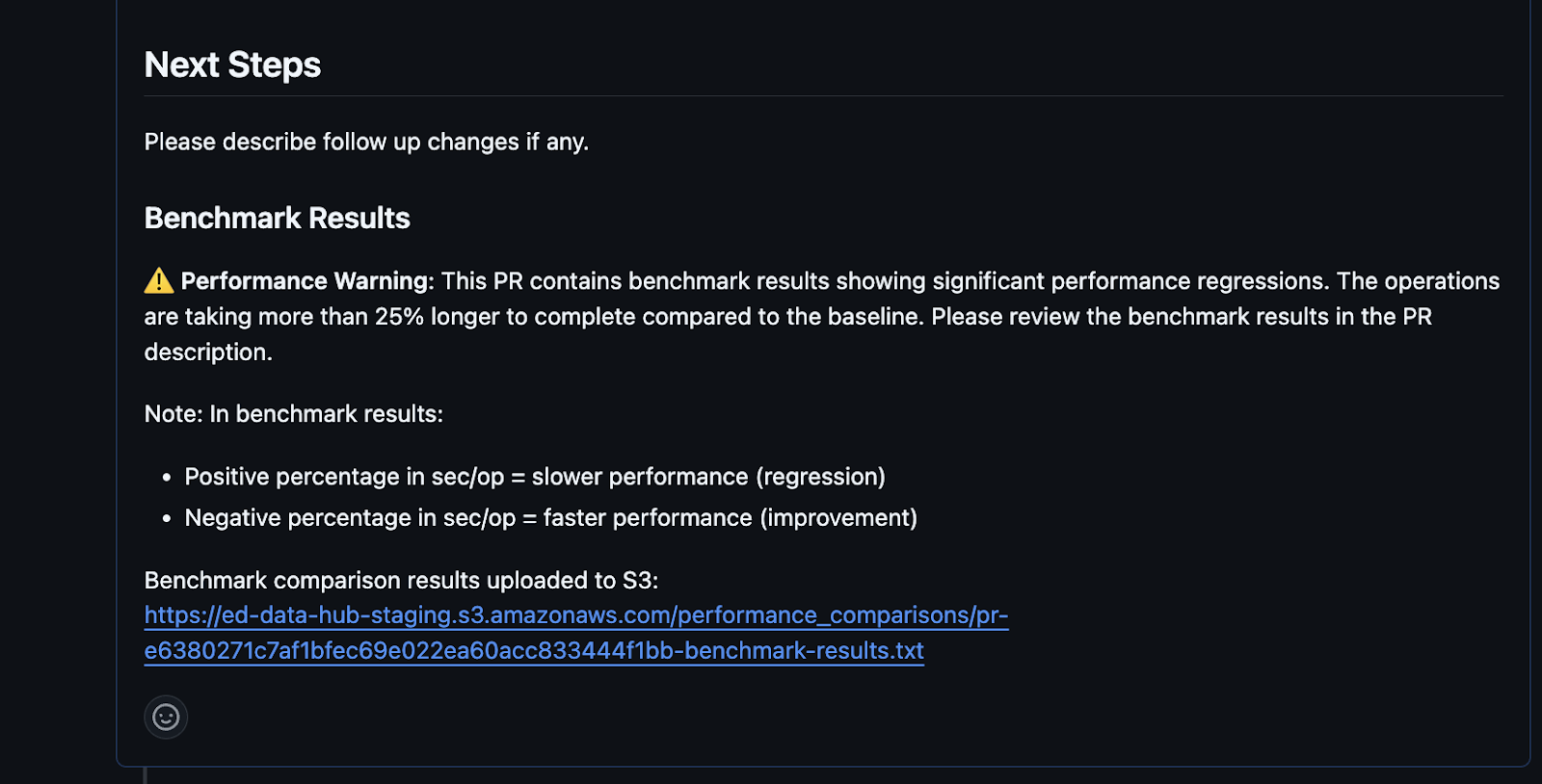 As you can see above, the test has collected benchmark results that indicate a performance regression. It has also provided a link to the S3 bucket where more detailed comparison results can be accessed.