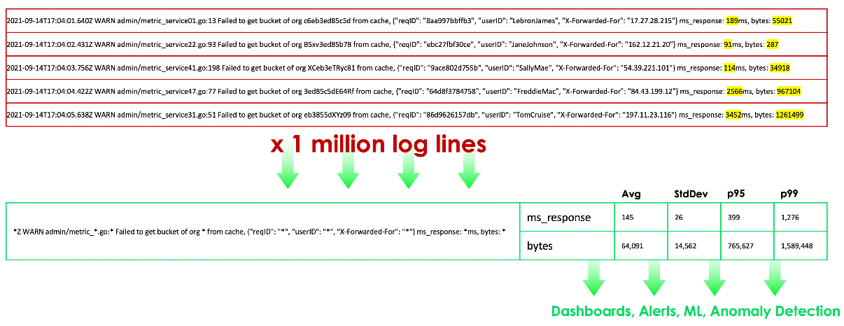 In the log lines below, we can see that not only are we automatically identifying the pattern, but we’re also augmenting the meaningful data which would otherwise not be captured by gathering the average, standard deviation, 95th percentile, and 99th percentile for both the response and number of bytes.