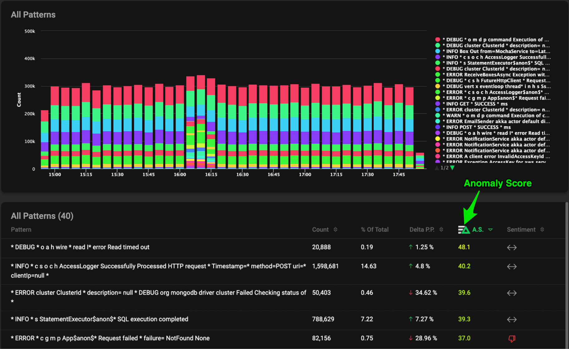 This data can then be forwarded to a centralized logging tool, a time series analysis tool, or the Edge Delta backend for further analysis across multiple agents, however our Agent isn’t done just yet… Now that we have metrics about the log messages themselves we can start looking for anomalies at the agent level, on the edge! We assign these anomalies a confidence score based on deltas in the previous time period, sentiment, and a few other ingredients. For more information about our Anomaly Score and Capture, contact us.