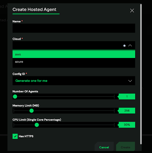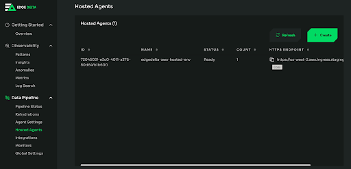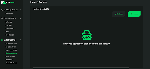 2. Create a Hosted Agent by navigating down to “Hosted Agents” under “Data Pipeline.” From this page, click the “Create” button.