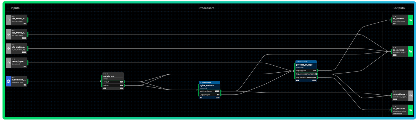 Compound nodes also provide an easy way for pipeline administrators to group observability functions by application teams or business units. With compound nodes, you can denote specific sub-pipelines that different teams are responsible for. So they can meet their observability needs without impacting others’ work or having to understand every area of the pipeline.