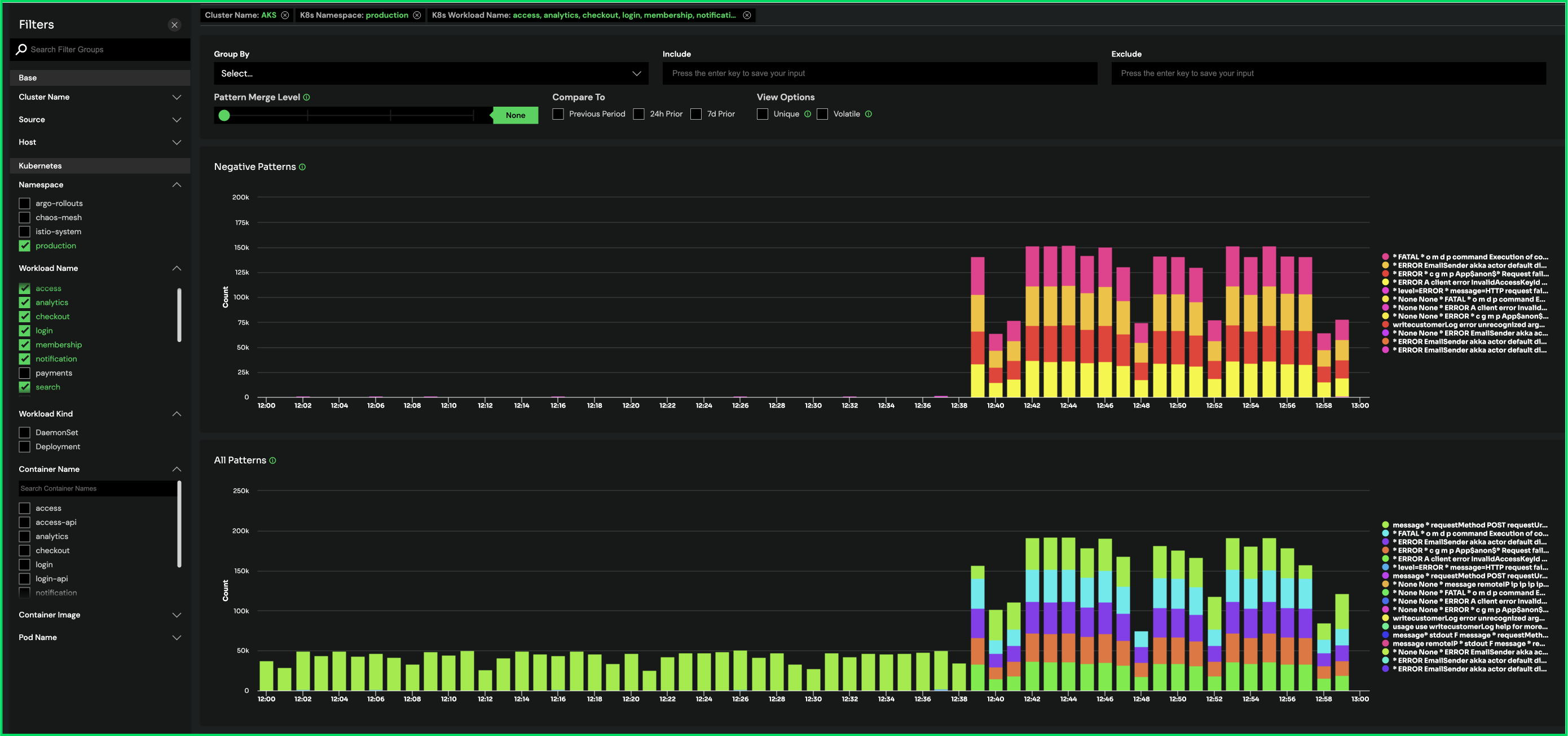 In the Patterns view, every recurring logline is aggregated into a cluster, instead of requiring you to sift through tons of raw data. Edge Delta provides analytics around each Pattern, so you can understand the scope and sentiment of message. This feature makes it easy to spot any changes or new behaviors. Patterns can be organized by different components so, for example, you could isolate behaviors at a namespace or container level.