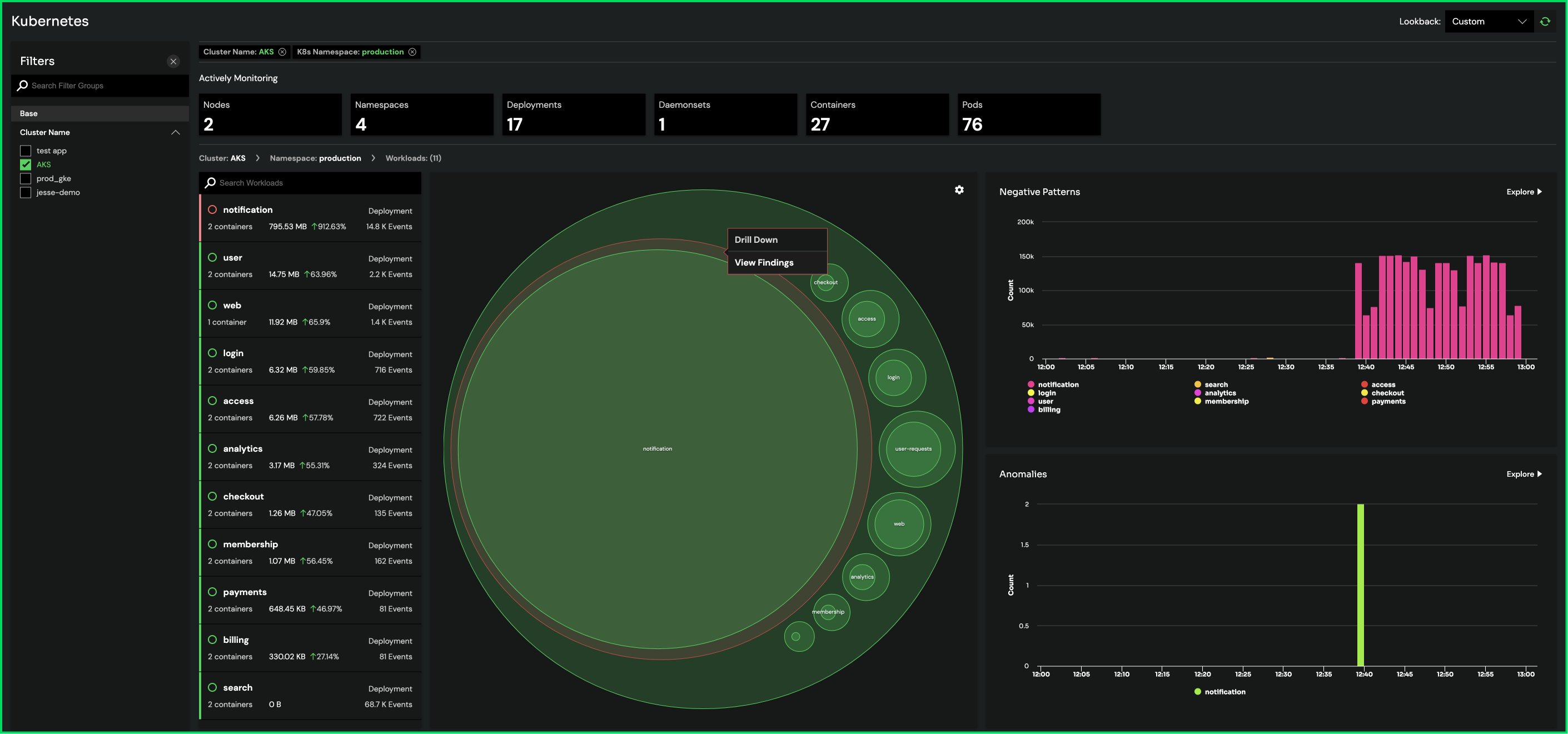 The insights are optimized for Kubernetes environments, making it easy to understand what is happening at each layer of a cluster. Operations teams can leverage our Kubernetes Overview to visualize the health of Kubernetes resources and drill into individual components for investigation.