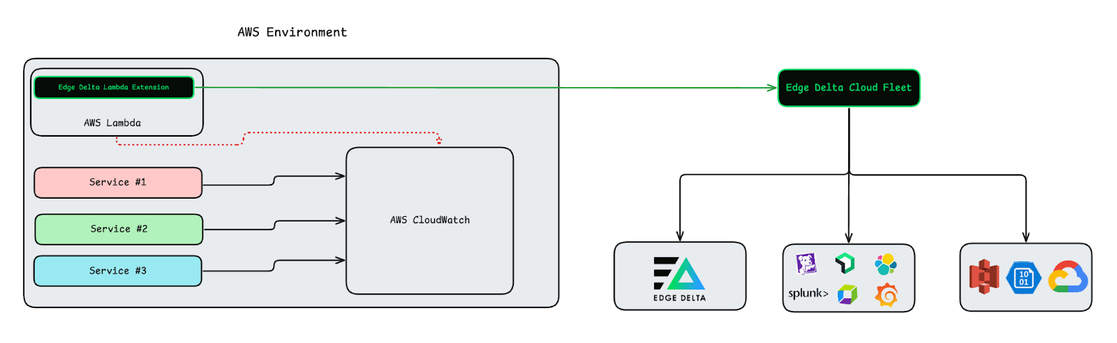 With Edge Delta’s Lambda Extension, Edge Delta users can easily circumvent CloudWatch by shipping Lambda logs directly into an Edge Delta Telemetry Pipeline, from where they can be easily routed to any downstream destination of their choice.