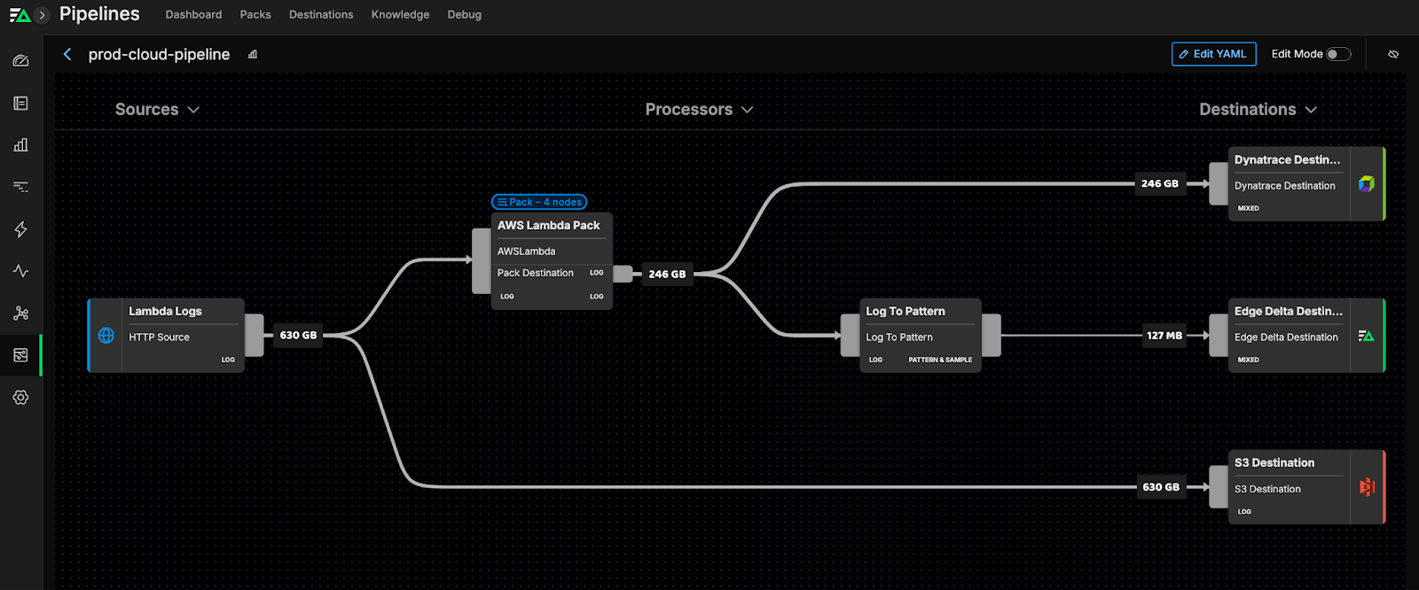 Additionally, with Edge Delta’s Lambda Pipeline Pack, teams can leverage a pre-built collection of processing steps to intelligently optimize and enrich their Lambda logs in stream with ease, keeping insight quality high while significantly reducing log volume and ultimately downstream cost.