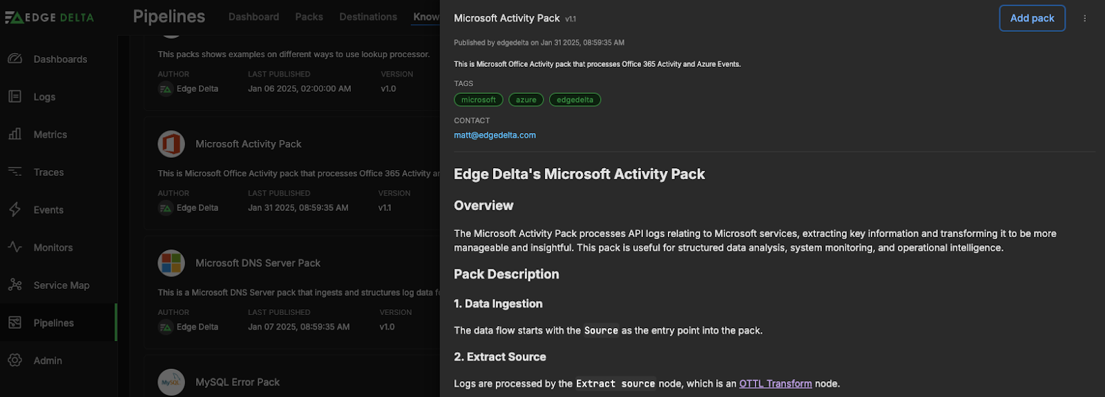 To begin using the Microsoft Activity Pack, you’ll first need an existing pipeline in Edge Delta.