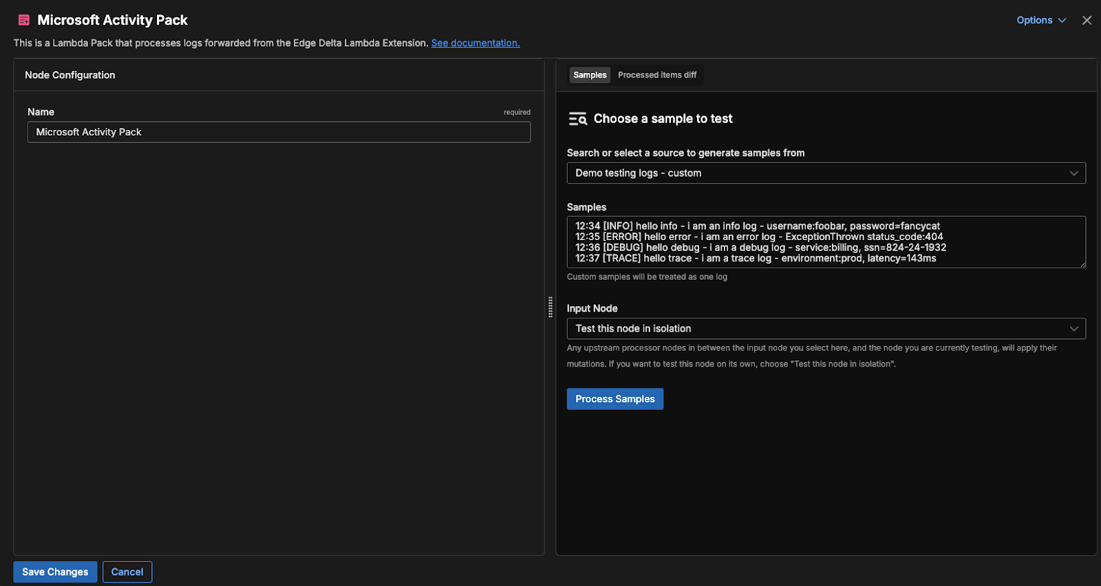 You’ll then have the option to rename the pack from “Microsoft Activity Pack” to anything you’d prefer instead. Once ready, click Save Changes to apply the pack to your pipeline. Then, head back to the Visual Pipelines builder and drag and drop the initial connection from your Microsoft logs source into the pack.