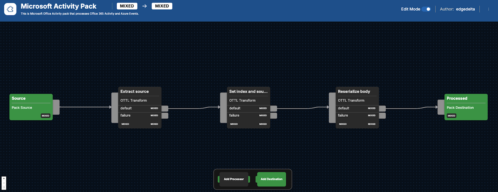 To install the pack into an existing pipeline, return to your Pipelines dashboard, choose the pipeline where you want to apply the Microsoft Activity Pack, enter Edit Mode, and configure it using the Visual Pipelines builder. While in the pipeline’s Edit Mode, click Add Processor, go to Packs, and select the Microsoft Activity Pack.