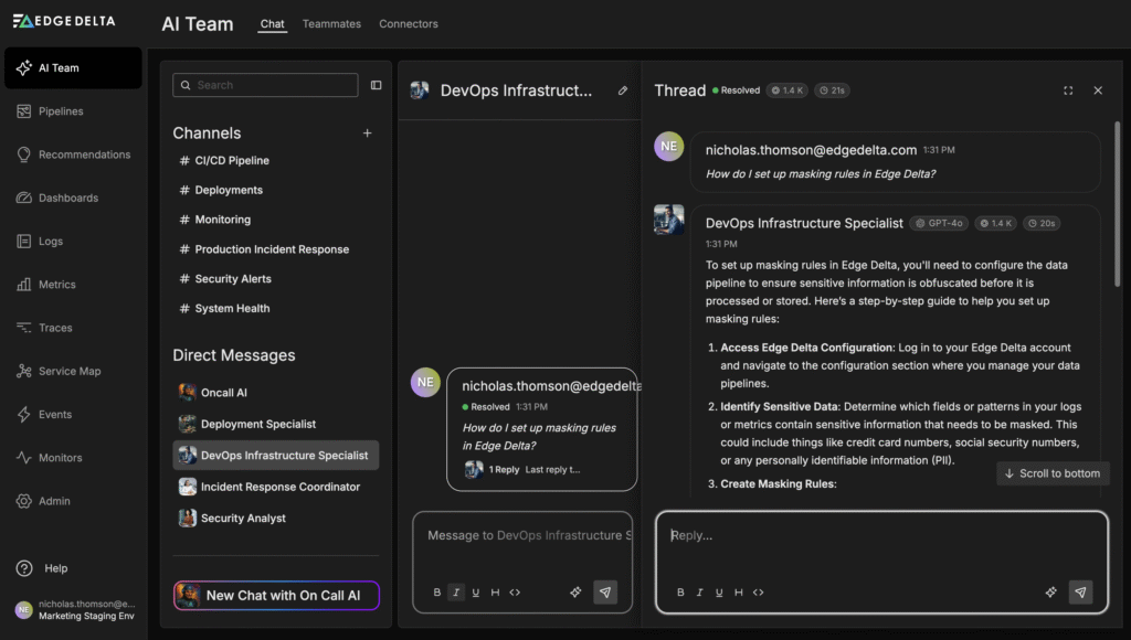 For example, imagine a new engineer has just joined your team and needs to configure a telemetry pipeline. Instead of digging through pages of documentation or pinging a senior engineer for help, they can simply ask their AI Teammate, “How do I set up masking rules in Edge Delta?” The agent responds instantly with the correct steps, pulled directly from the official documentation.