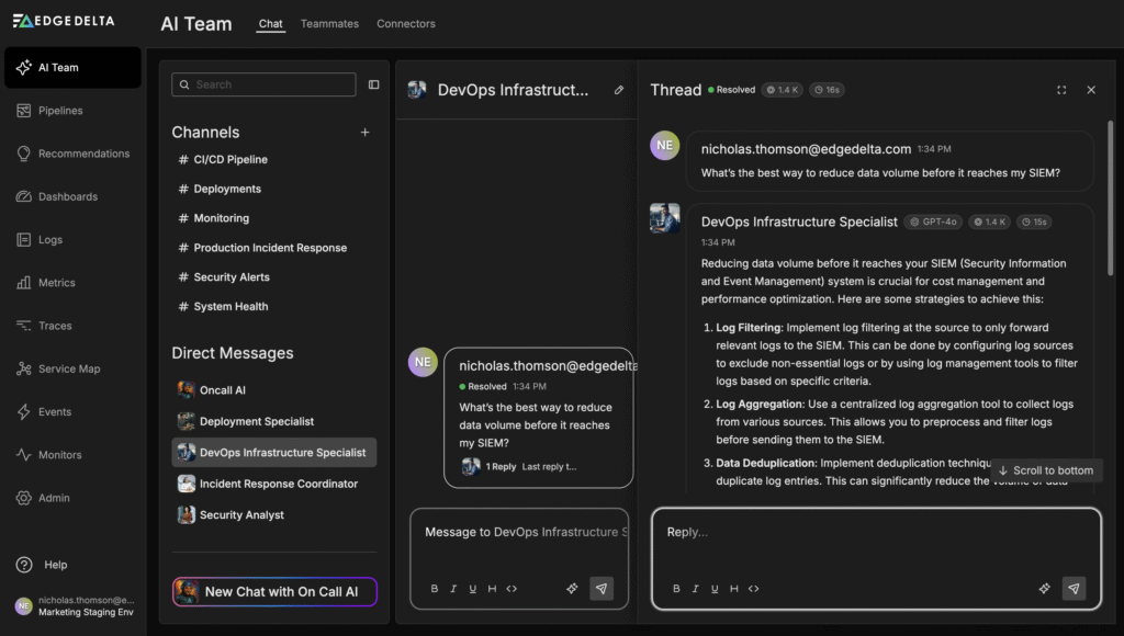 With Edge Delta’s RAG-powered search, AI Teammates can step in as a first line of support. An engineer might ask, “What’s the best way to reduce data volume before it reaches my SIEM?” or “Can you show me the OTTL syntax for standardizing this log field?” The specialized agent responds with instructions sourced directly from Edge Delta’s docs, providing not only the syntax but also context on why a particular approach is effective.