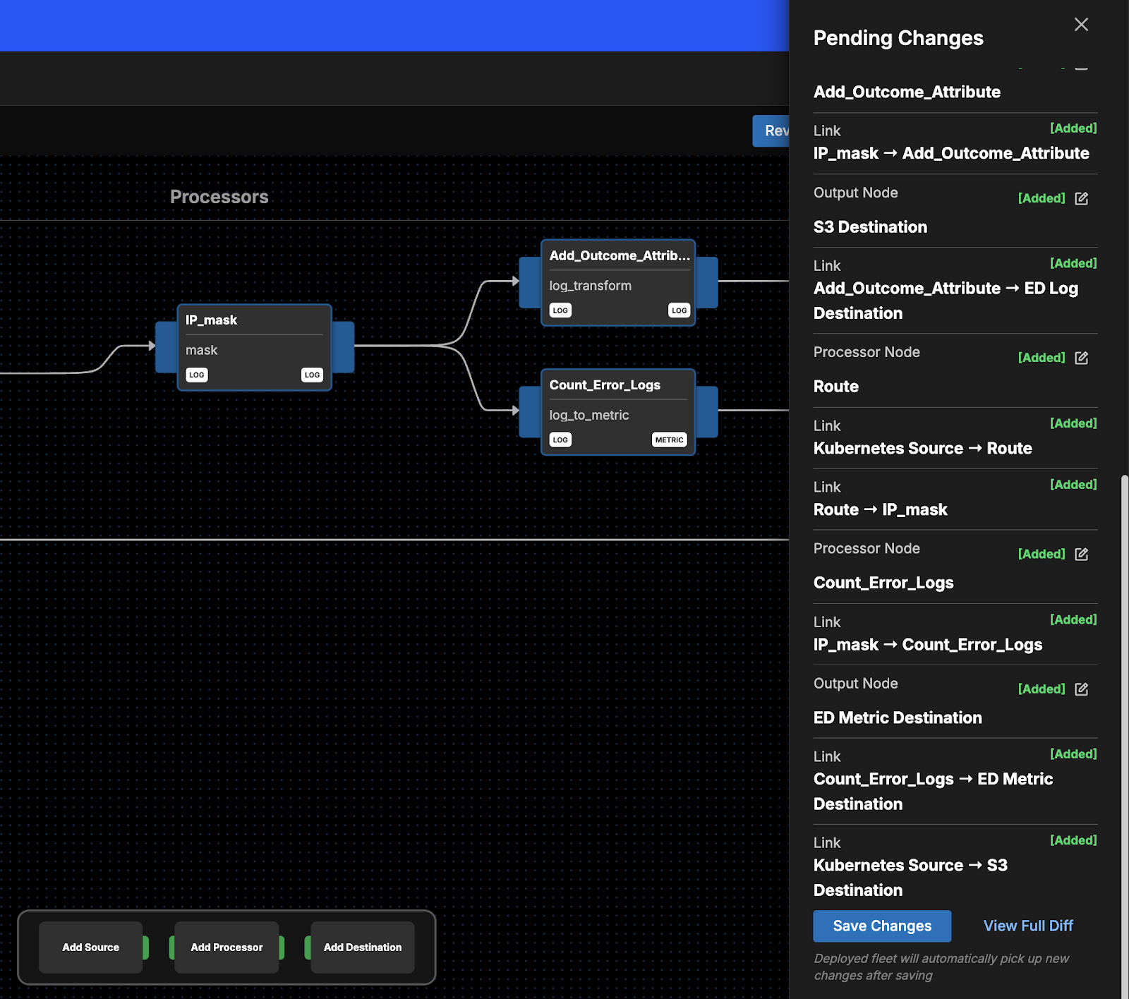 In a matter of minutes, we have a fully functioning Telemetry Pipeline within Edge Delta. And before publishing this pipeline, you can review all changes to ensure everything looks as expected:
