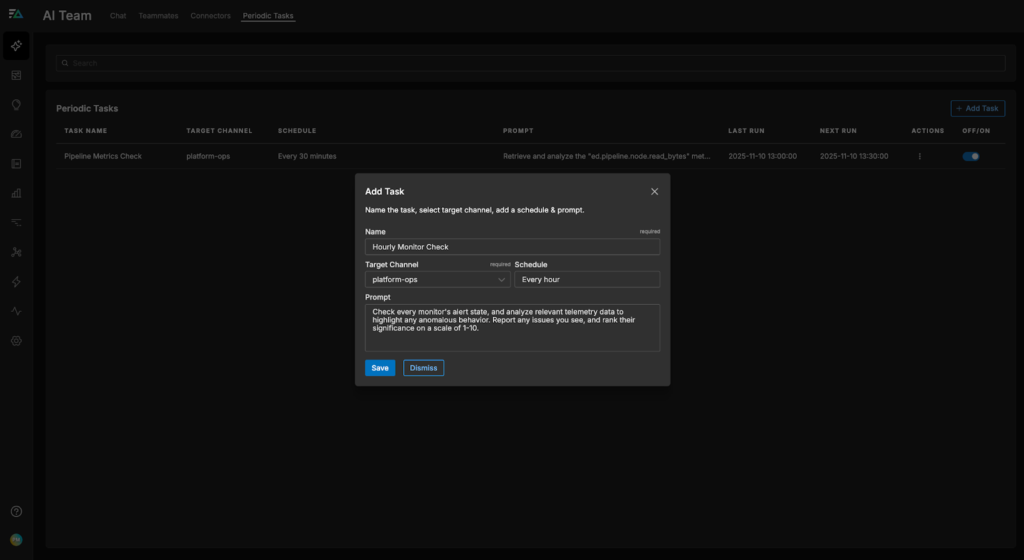Instead of forcing humans to analyze and prioritize each active alert — which could take hours — let’s set up a Periodic Task for AI Teammates to do it instead. First, we’ll navigate to the “Periodic Tasks” tab in the “AI Team” section, and select “Add Task.” Then, we’ll give Teammates a plaintext request to watch over our monitors, set a frequency and target channel, and save it: