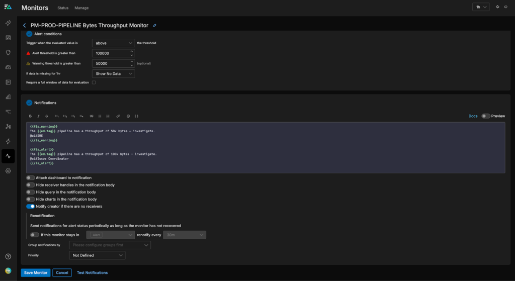 To set this up, all we need to do is tag a Teammate in the “notification” portion of the monitor. For instance, we can configure the “PM-PROD-PIPELINE Bytes Throughput” monitor to notify the SRE Teammate when it enters a WARN state, or call the Issue Coordinator Teammate when it enters an ALERT state: