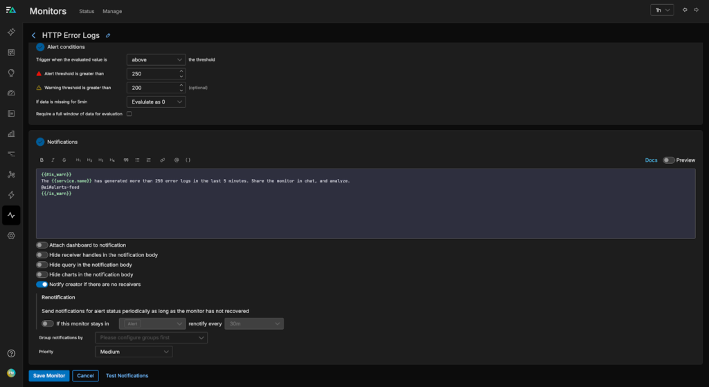If we aren’t sure which Teammate is the best choice to respond, we can also send a general message in a specified channel and let On Call AI decide in real time, as shown in the configuration for the “HTTP Error Logs” monitor below:
