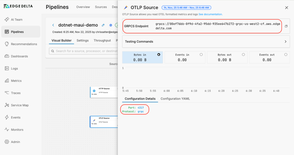 Now that we’ve covered the requirements for instrumenting a .NET MAUI application with OpenTelemetry, this section will walk through how to configure the OTLP exporter so that traces can be sent to Edge Delta for processing and visualization.