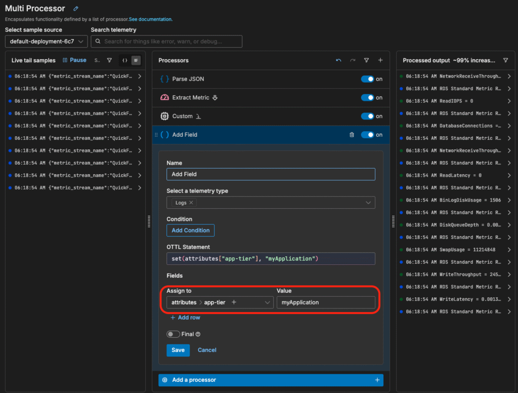 Edge Delta’s built-in processors make it easy to add tags to your data at any point in the pipeline. Tags can be applied to all data or to specific data based on relevance, enabling more precise filtering, correlation, and routing of observability signals: