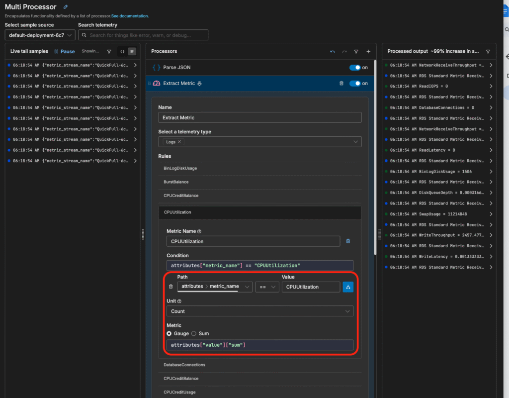 You can also extract metrics directly from your data. For example, if a log entry contains CPU utilization values, Edge Delta can parse that information and convert it into a time series metric, enabling you to visualize trends, create alerts, or correlate it with other telemetry data: