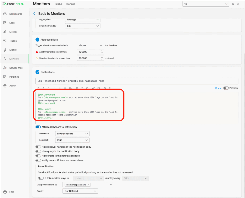 For more information on how to set this up, please refer to Edge Delta’s documentation for monitors, thresholds, and notifications.