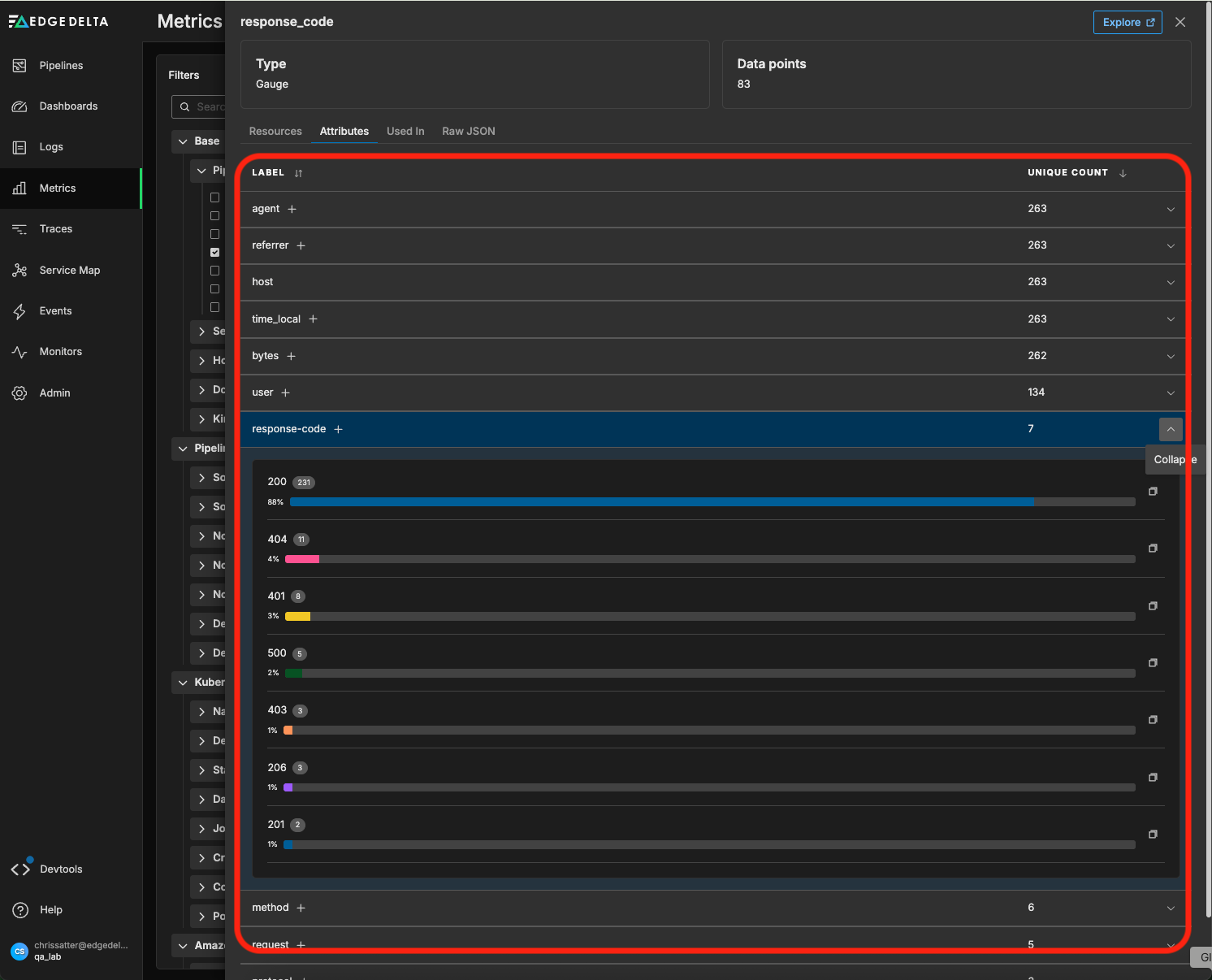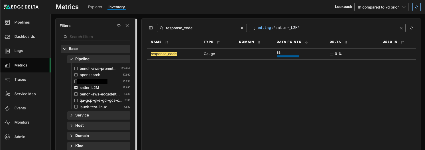 Once we’ve saved this configuration and the “response_code” metric begins flowing into Edge Delta, we can view it in the Inventory tab of the Metrics section:
