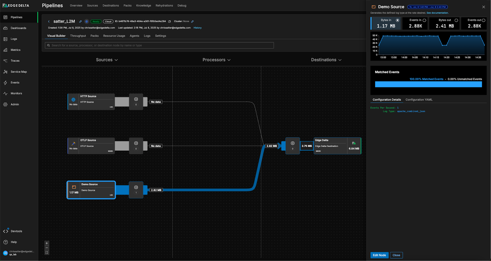 To demonstrate, we’ve set up an Edge Delta Pipeline that’s configured to collect Apache log data via a demo input and route it into Edge Delta’s Observability Platform.