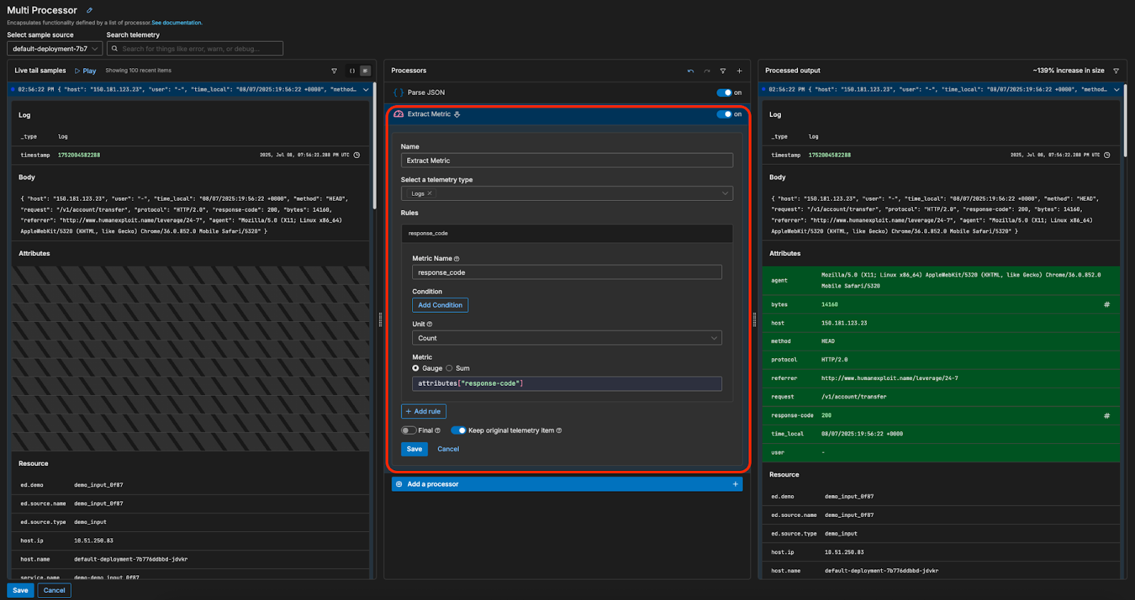 For this example, we’re interested in the frequency at which the Apache server is generating different response codes. Once parsed, each Apache log has an associated response code stored under its “response-code” attribute — all we need to do is extract those values as metrics and ship them downstream. First, we’ll send the Apache logs through an “Extract Metric” processor: