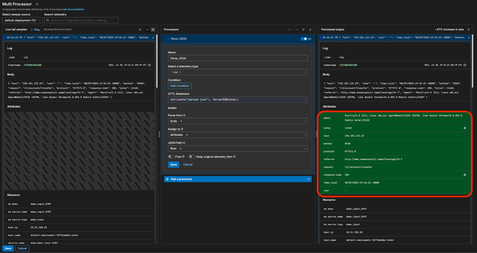 We’ll first add a Parse JSON processor to the pipeline, which will parse the Apache log data and store its attributes in a structured format: