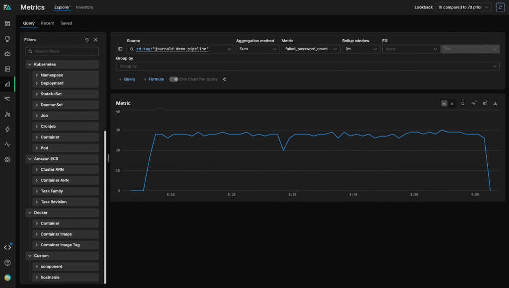 Once data is flowing into Edge Delta, we can start analyzing it to identify and resolve issues on our Ubuntu machine. First, we can visit the Metrics page to track the “failed_password_count” metric we created in the previous section: