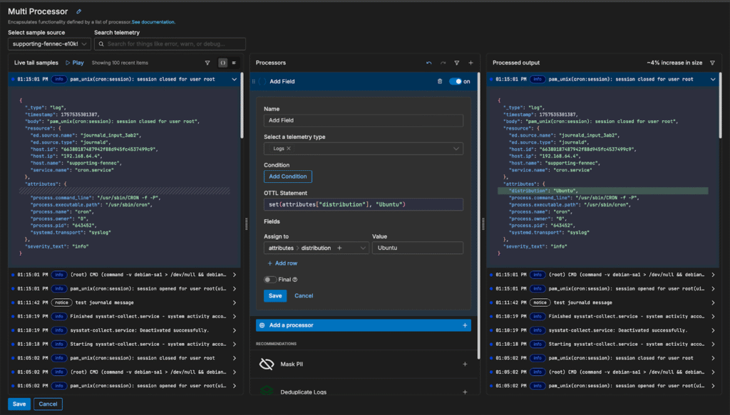 Once the new pipeline configuration is saved, logs will immediately start flowing. We can now enrich the data with key tags to help correlate them with specific workflows or applications. For example, we can tag logs with “Ubuntu” to distinguish them from other distributions and segment them more easily downstream: