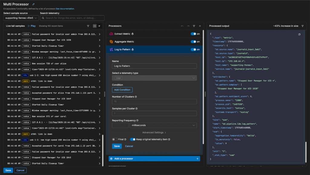 With Edge Delta’s Telemetry Pipelines, teams can manage modern journald log volumes much more effectively with pre-index processing. This allows them to enrich data, convert logs into metrics, and intelligently identify anomalous patterns in real time. Once the data is indexed downstream (in this case, in Edge Delta’s Observability Platform), teams can quickly visualize these logs and metrics to detect and resolve issues at scale.
