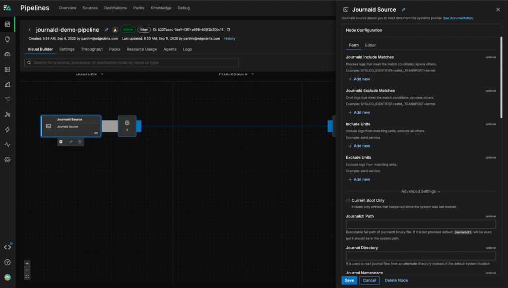 Edge Delta offers structured journald log collection for any Linux distribution, removing the need for brittle collectors or complex scripts. To illustrate how it works, let’s configure a Node Pipeline to collect and process journald logs generated by an Ubuntu Linux machine.