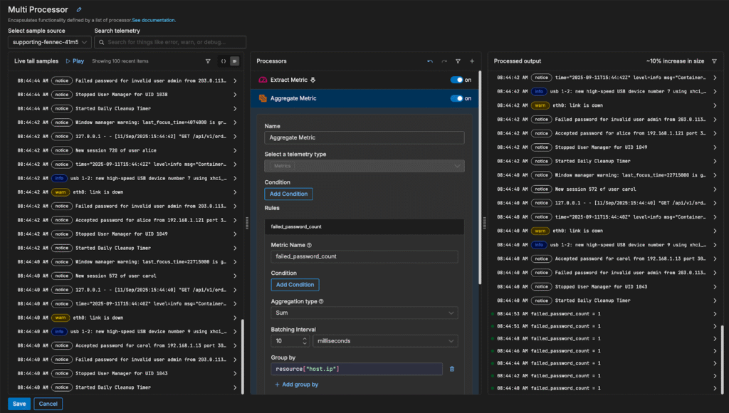 We can also convert logs into metrics before indexing in order to isolate particular trends we’re interested in. In this case, let’s keep track of the number of failed ssh attempts into our machine over time. To do this, we can add an “Extract Metric” processor to capture each failed login attempt, and add an “Aggregate Metric” processor to group them into a single metric: