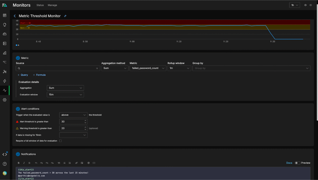 Lastly, we can create a monitor to alert us when failed password attempts cross a pre-defined threshold: