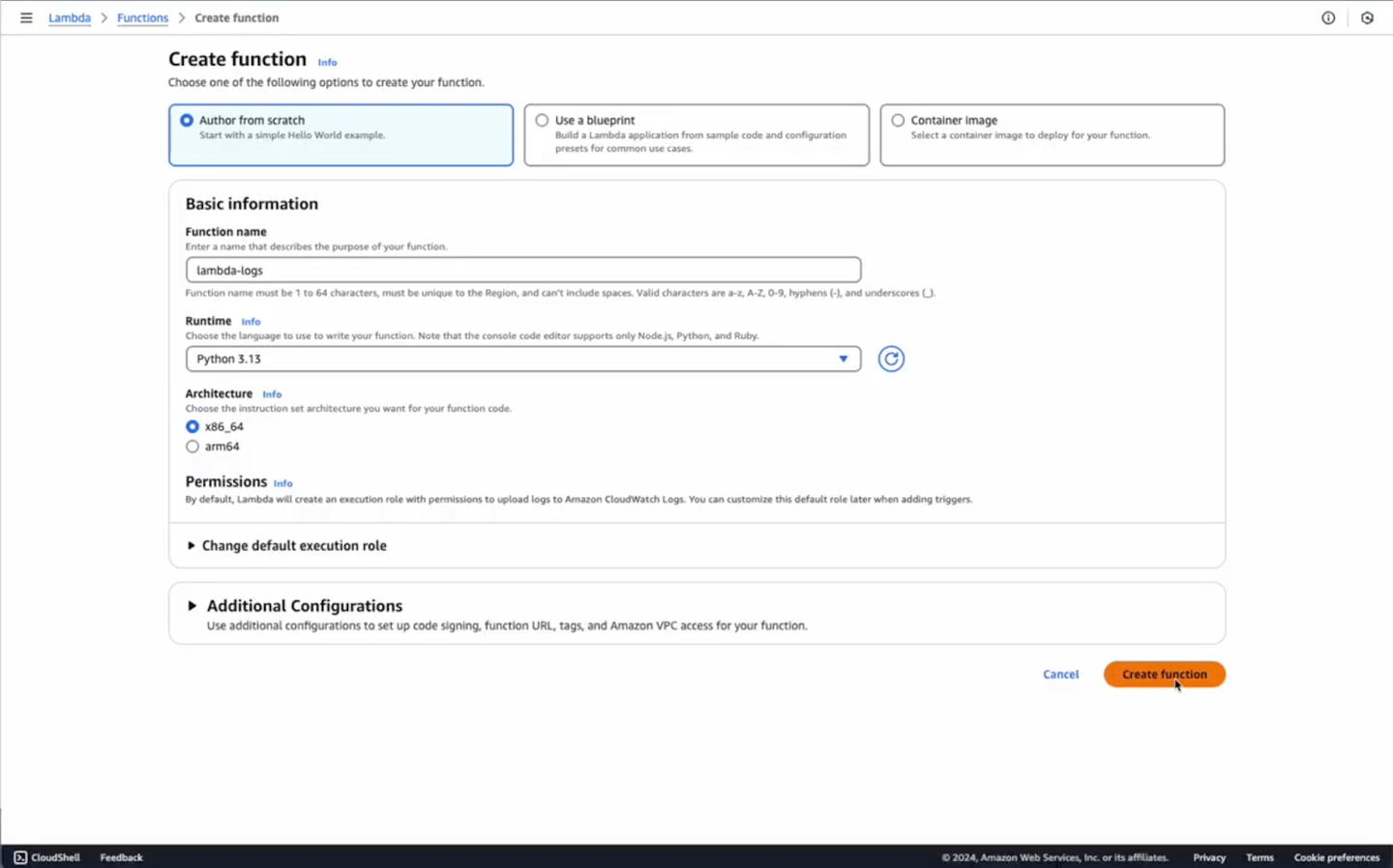 - Click Create function, select Author from scratch, and populate Function name.