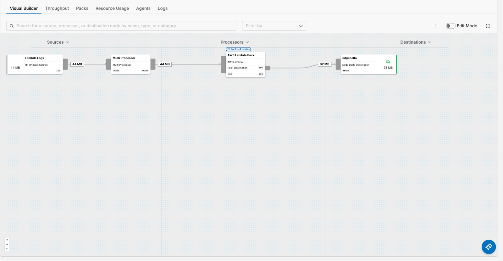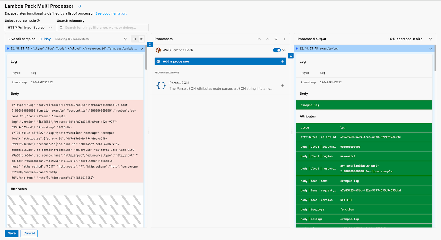 Your new Edge Delta Pipeline is listening for logs on HTTPS (which is how we’re going to be transporting the Lambda logs) and gRPC, and is currently configured to route them directly into Edge Delta’s backend. But before you begin ingesting logs, you should first configure your pipeline to structure and enrich them. Edge Delta’s AWS Lambda Pack automatically unrolls and optimizes Lambda log data, and it can be easily added to any running pipeline by following these steps: