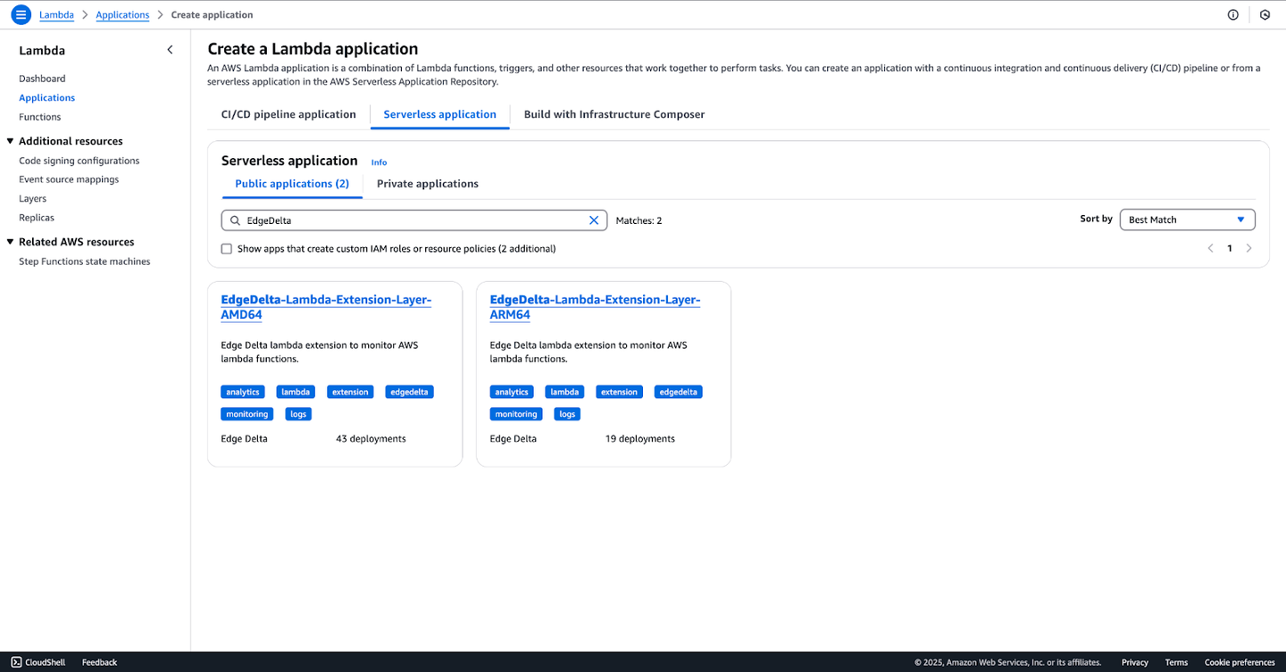 Once the test function is created, you’ll need to grab the Edge Delta Lambda Extension from the AWS serverless applications list. Once the extension is added to an AWS account, it can be reused in any Lambda function within it. To add the Edge Delta Lambda Extension: