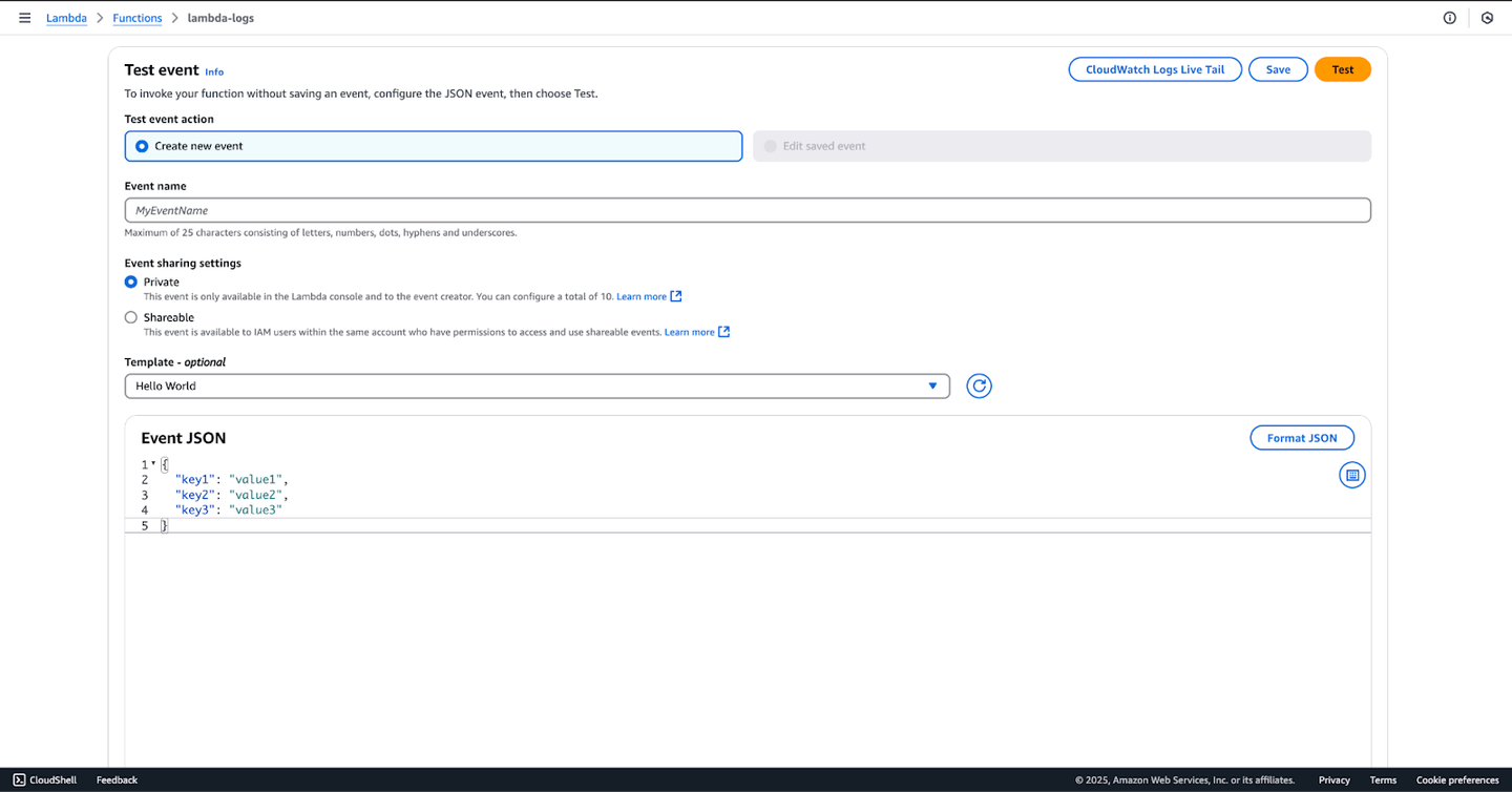 Note: this is a simple test Lambda function used for demonstration purposes. Any AWS resource that writes to CloudWatch can be used to demonstrate and validate the functionality.
