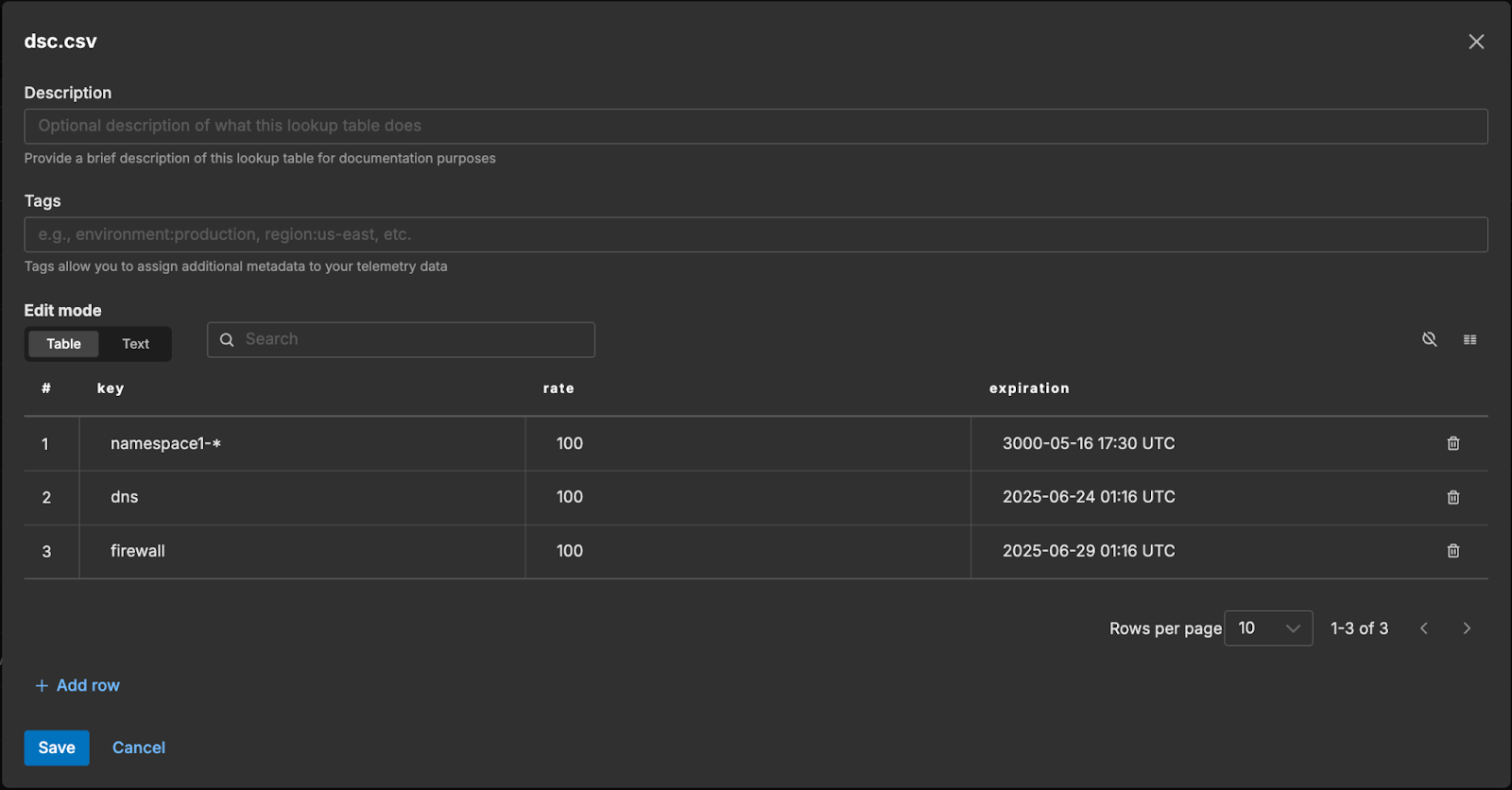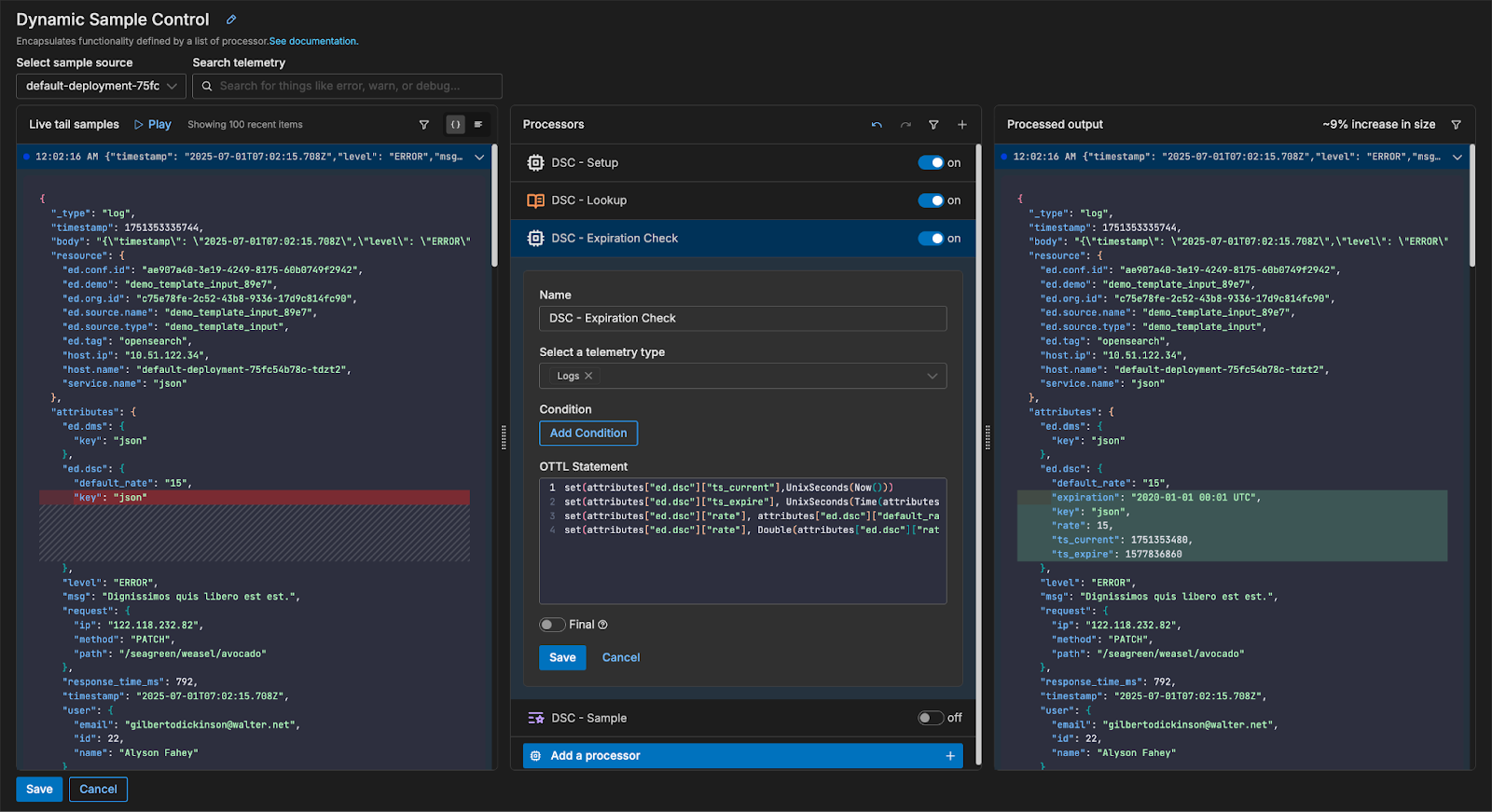 The following processor then applies conditional logic to check if the expiration date specified in the lookup table is in the past. If it is, the pre-configured default sample rate is applied. If the expiration date is still in the future, the system uses the rate pulled from the lookup table and stores it in the telemetry object’s {rate} attribute field.