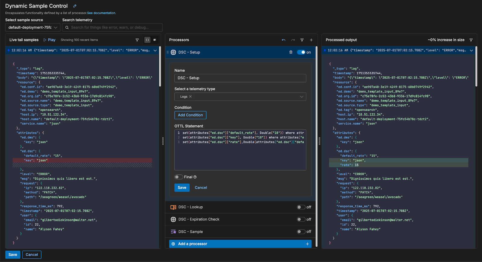 First, a custom OTTL (OpenTelemetry Transformation Language) statement prepares the incoming data by tagging each item with a default rate in its {attributes} section. This initial step is crucial, as it specifies the baseline sample rate that enables dynamic sampling on the specific telemetry objects you define.
