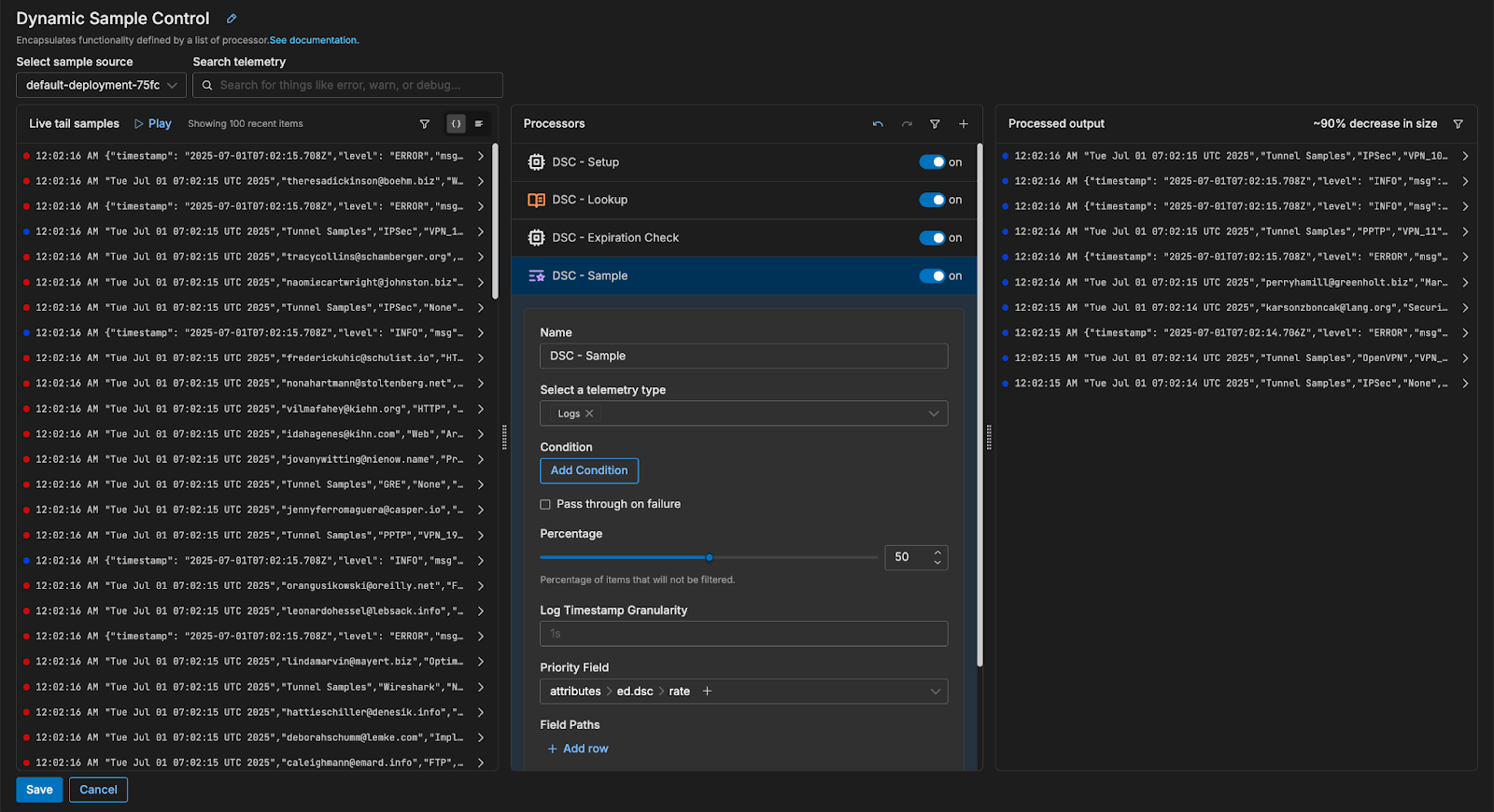 Traditional implementations of dynamic sampling involve running several complex workflows to synchronize external events with telemetry data sampling rates. With Edge Delta, it’s as simple as adding a few processing nodes into a Telemetry Pipeline using our point-and-click interface.